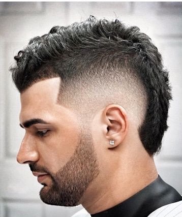 The burst fade wraps around the ear in a semi-circle shape, often paired with a mohawk or textured top.